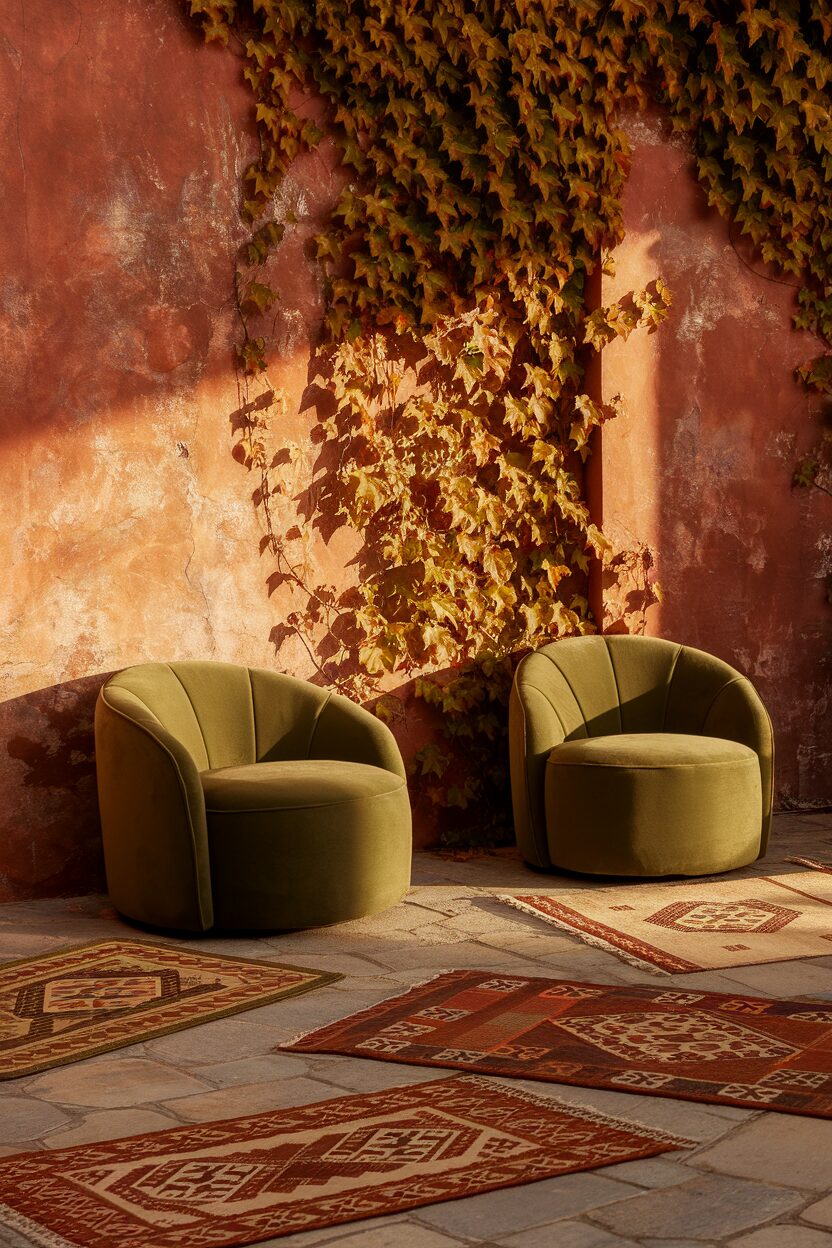 Olive green armchairs bring a hint of nature inside, creating a calming environment. This color is perfect for a reading nook or a quiet corner.
