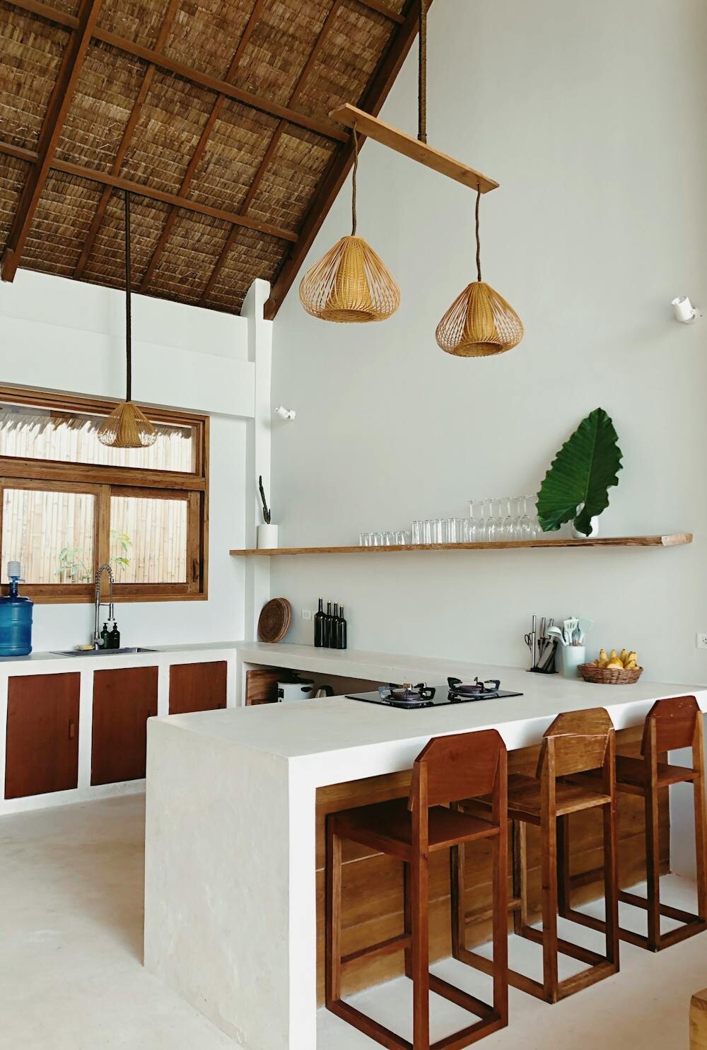 These stools offer comfort and a bit of bounce, perfect for long conversations over breakfast. Their natural texture and color are warm and inviting.