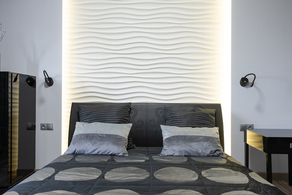 The wave headboard creates a peaceful bedroom retreat. Its design is both soothing and stylish.