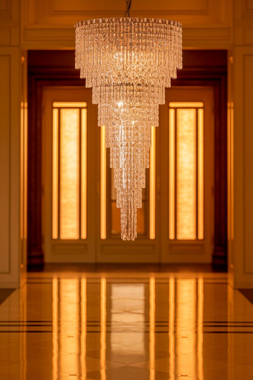 A crystal chandelier brings sparkle and sophistication to any room. It creates a focal point that draws the eye.