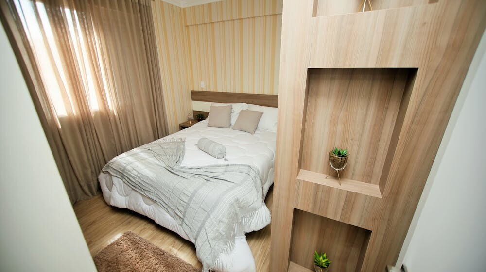 A floating nightstand hovers beside your bed, keeping essentials close. It’s a modern twist on a classic piece.