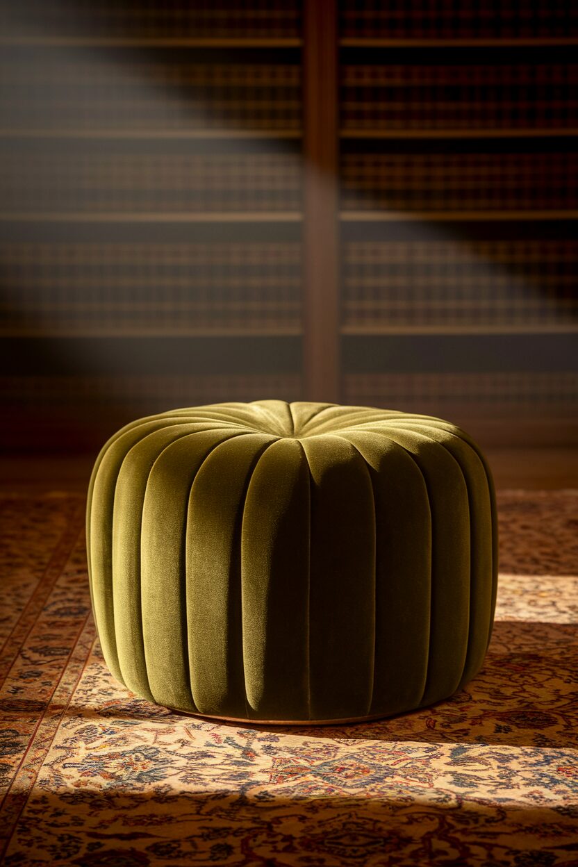 A velvet pouf is a small yet versatile piece. Use it as a footrest, extra seat, or even a decorative element.