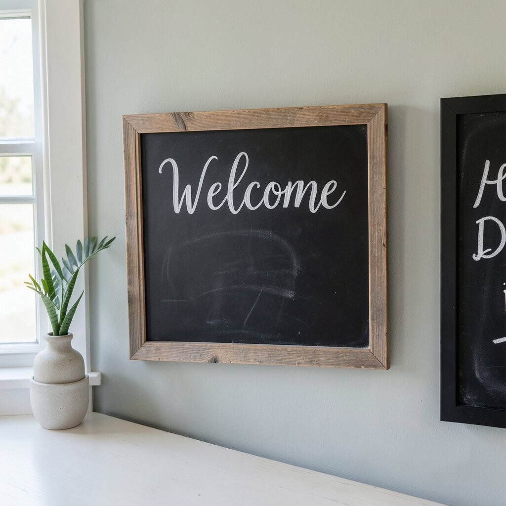 Welcome your guests with a personalized chalkboard sign at the entrance. A friendly message instantly makes your home feel inviting.
