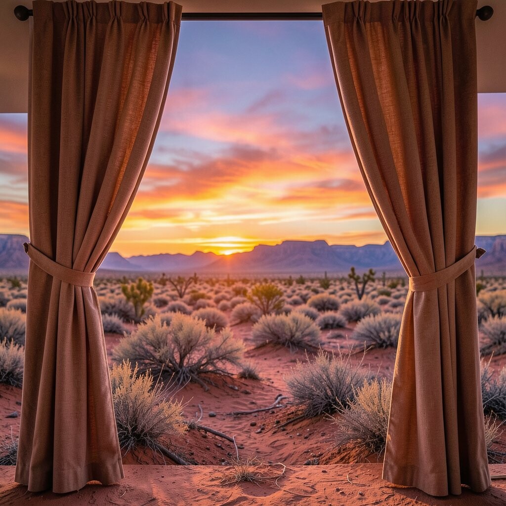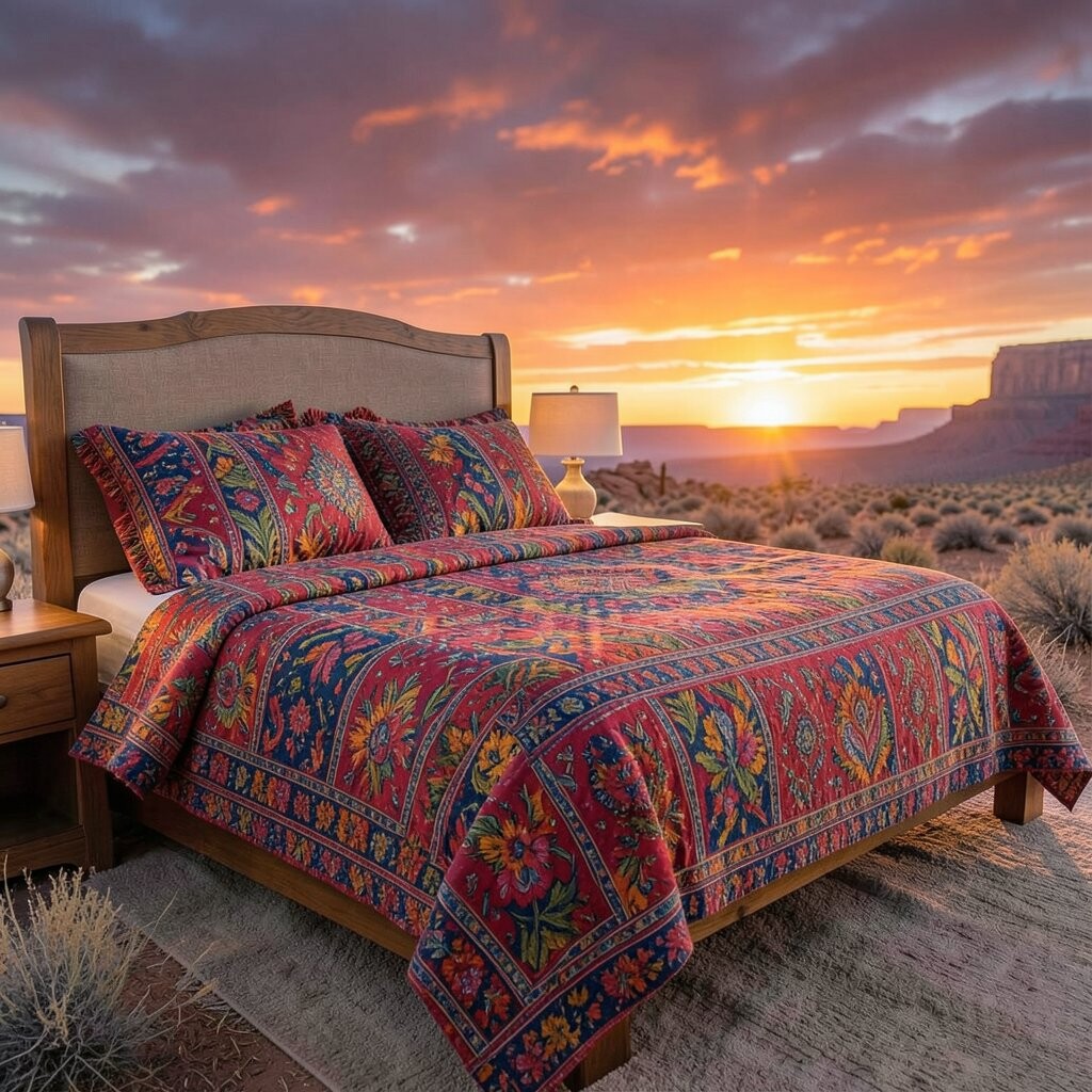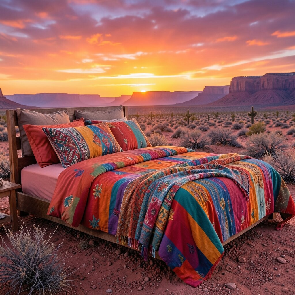 A bedspread in desert sunset colors can make your bedroom feel like an oasis. It’s like wrapping yourself in the warmth of the desert sun.