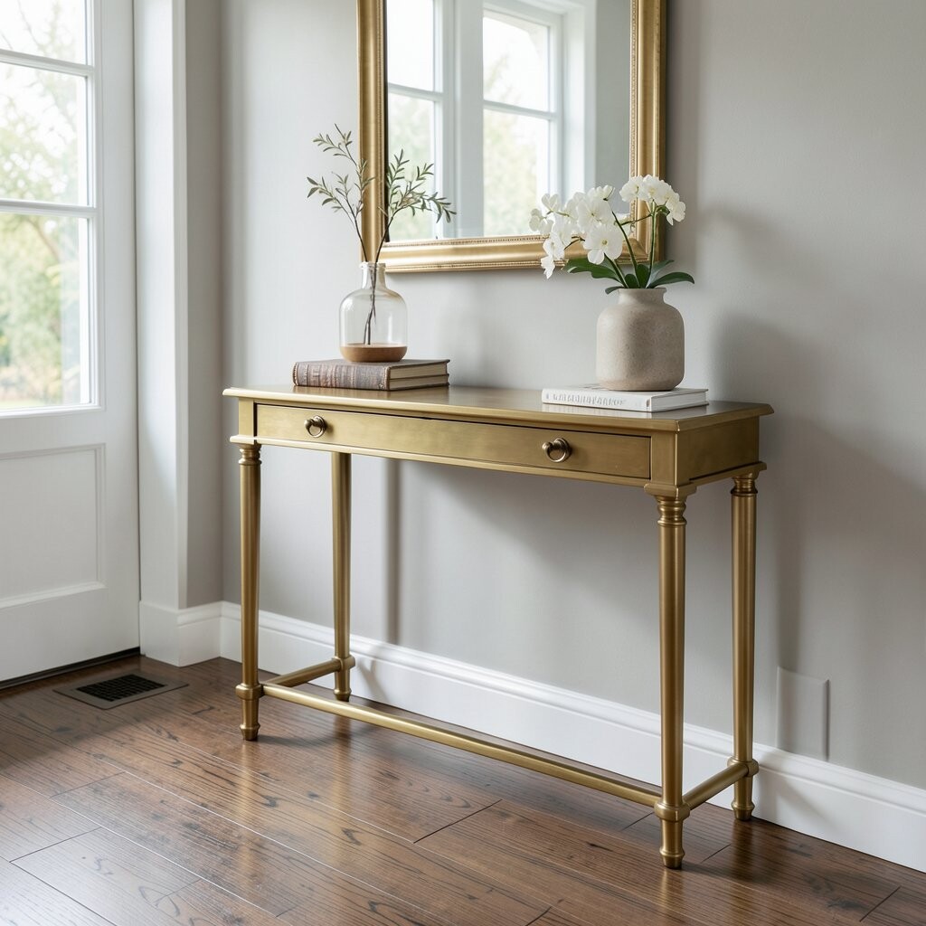 A brass console table can be the centerpiece of your entryway. It offers a surface for decorative items like vases or photo frames.
