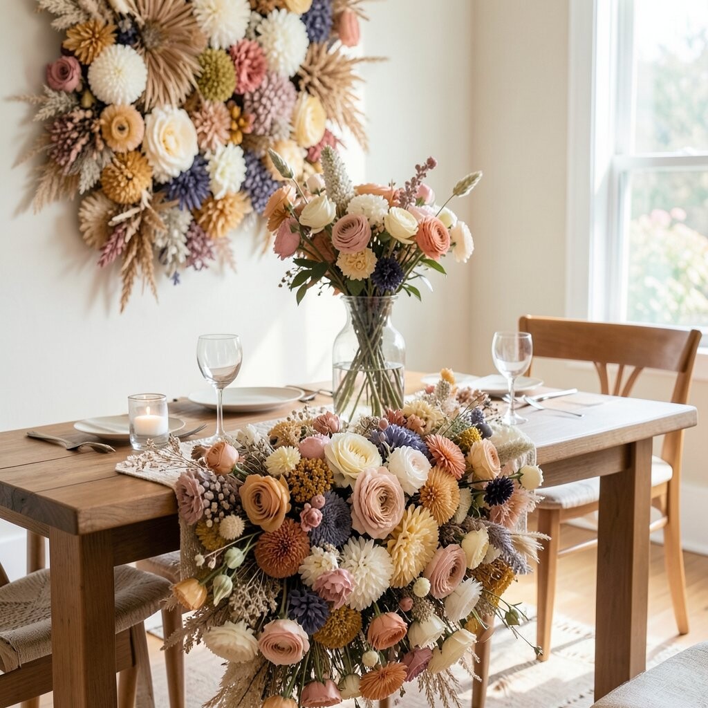 A table runner made of dried flowers is an elegant centerpiece for any dining table. It brings a touch of nature to your meals.
