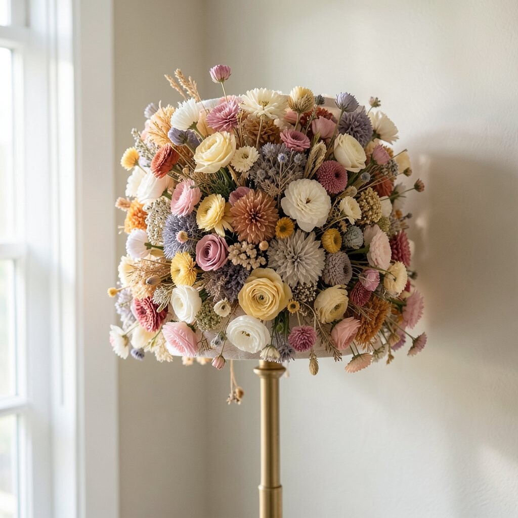 A lampshade with dried flowers adds a cozy, floral glow to your room. It’s a subtle way to incorporate nature into your lighting.