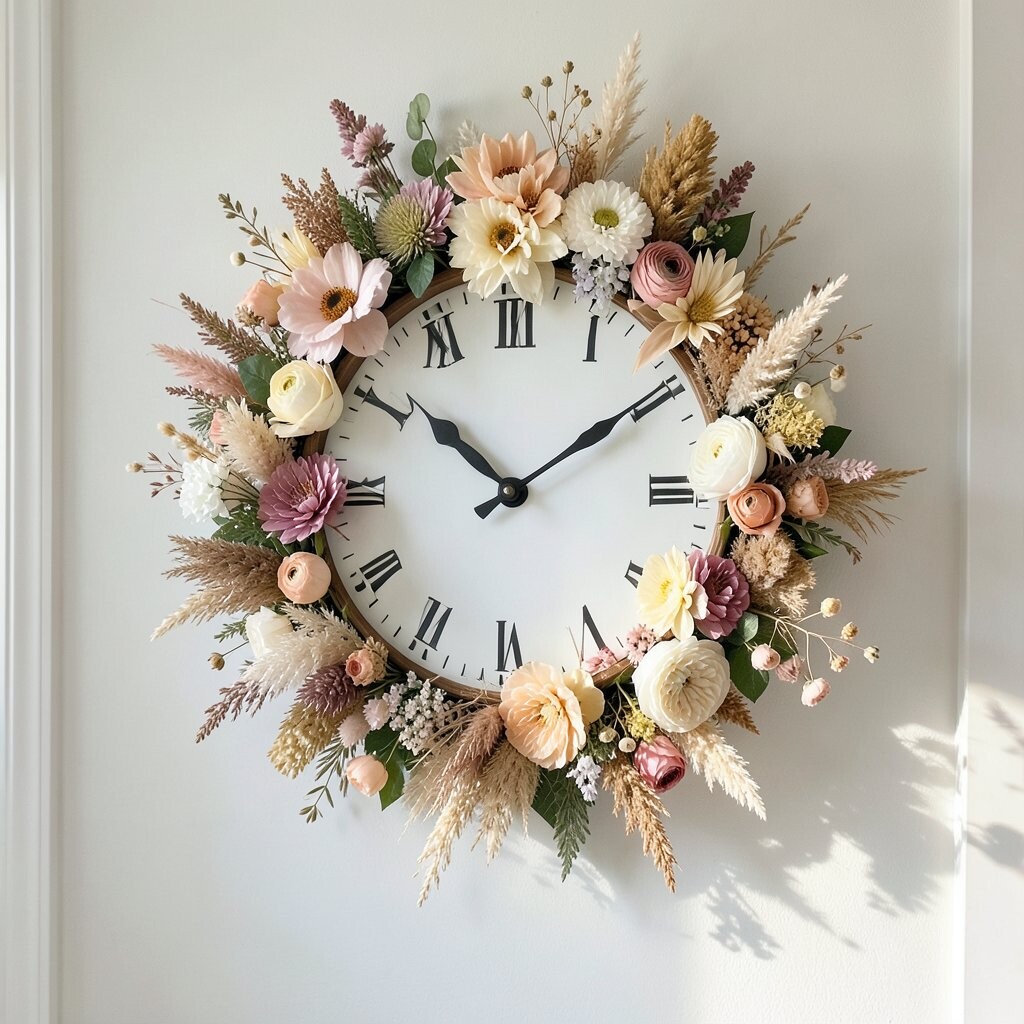 A wall clock adorned with dried flowers is a unique blend of function and beauty. It’s a creative project that turns time-telling into art.
