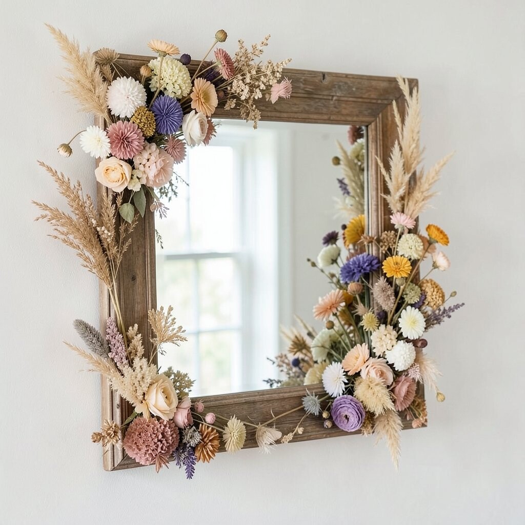 Dried flowers can transform an ordinary mirror into a statement piece. It’s a creative way to add a floral touch without overpowering your space.