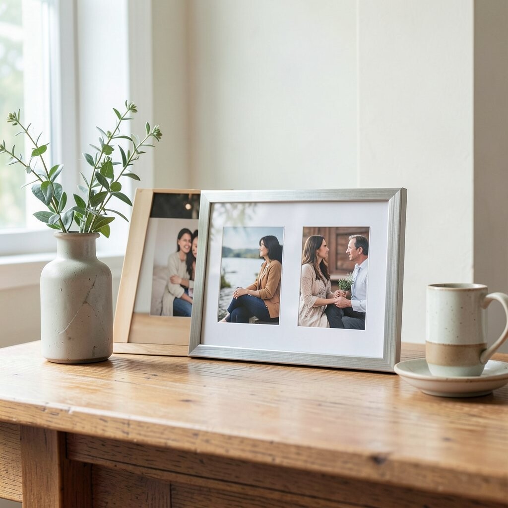 Mix family photos, travel shots, and art for a diverse display. Frames can add an extra layer of style.
