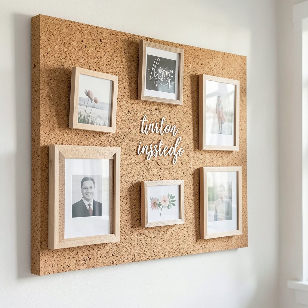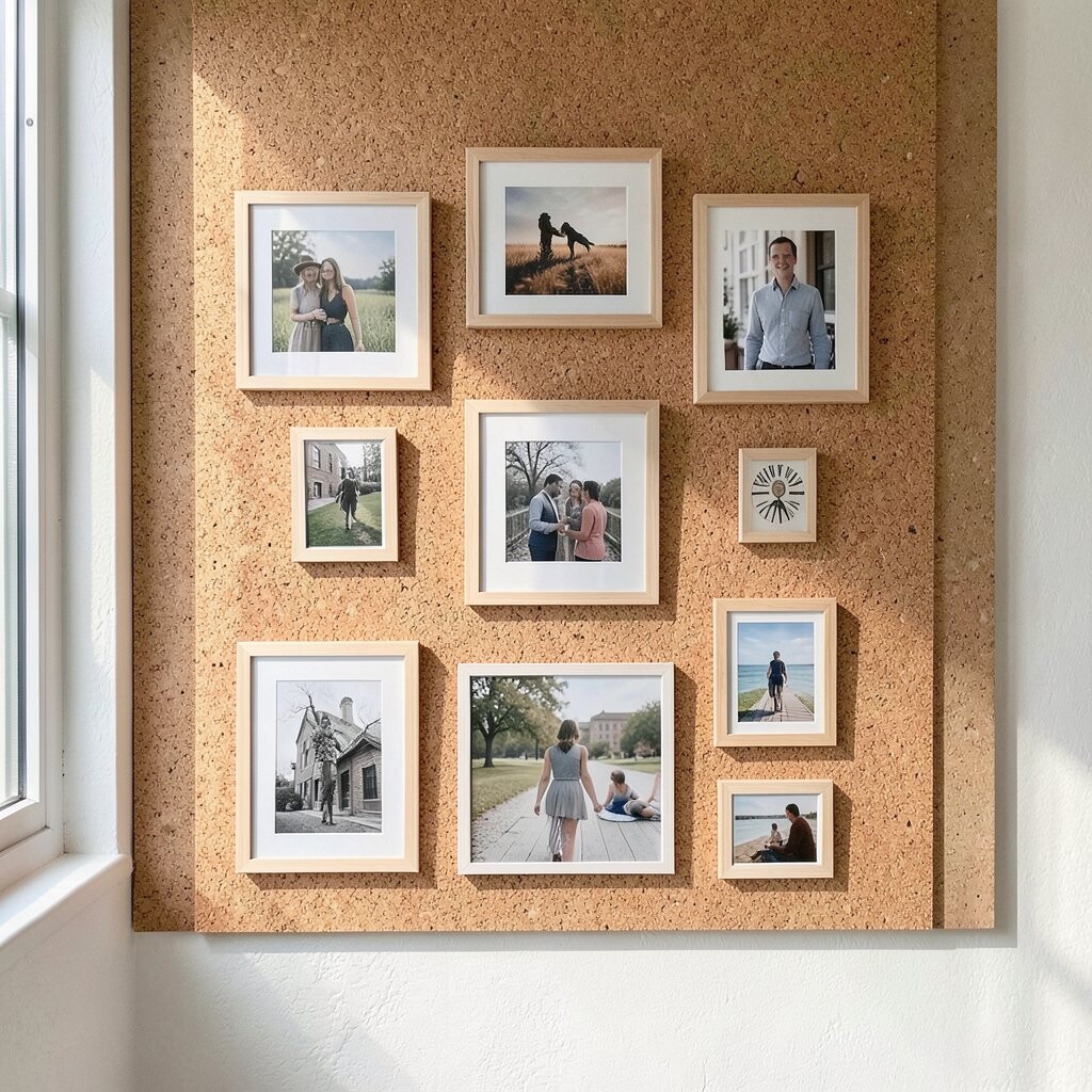 Use black and white photos with simple frames or borders. The contrast will make each image pop against the cork’s natural texture.