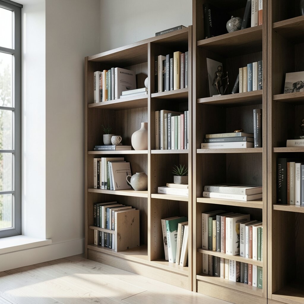 Arrange your books by color, size, or theme for a neat and stylish look. Add decorative objects and plants for variety.