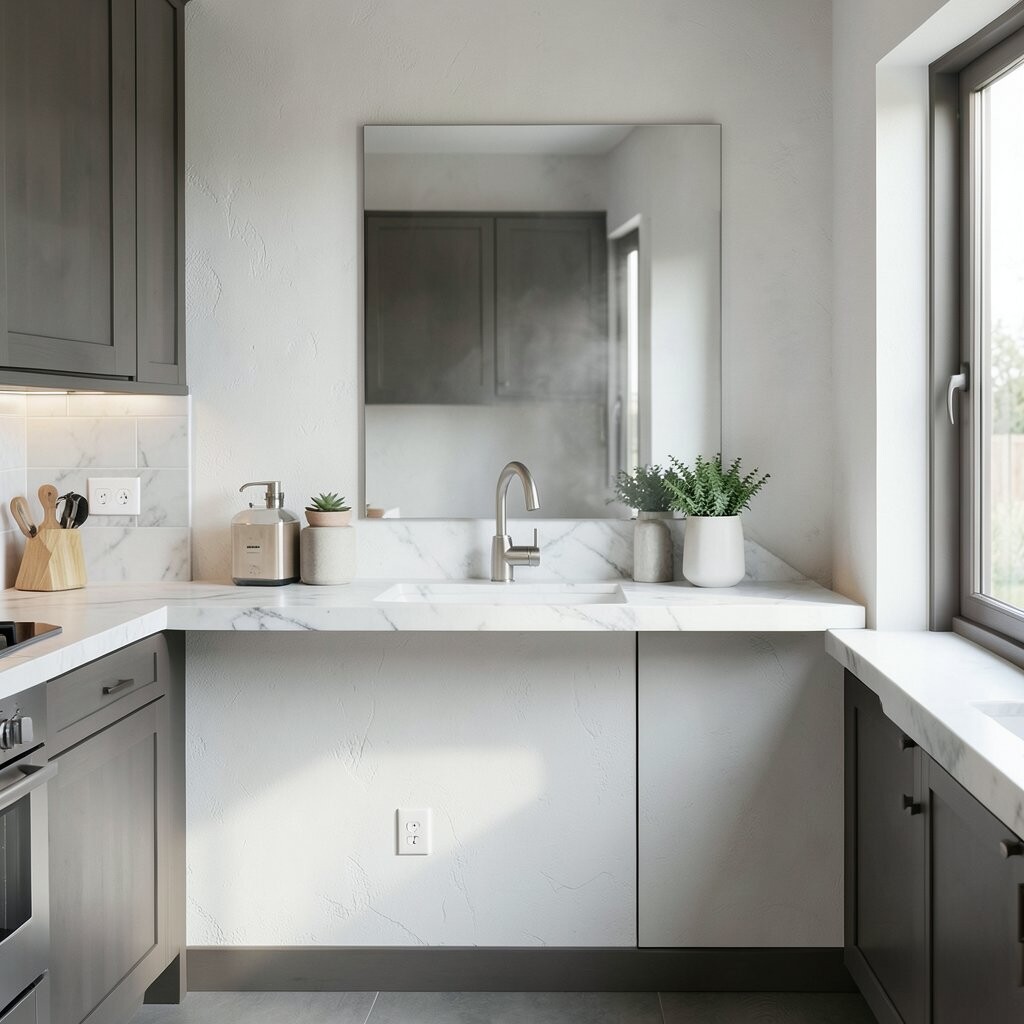 Mirror ledges are unique because they play with light and space. They’re perfect for small kitchens that need a little extra sparkle.