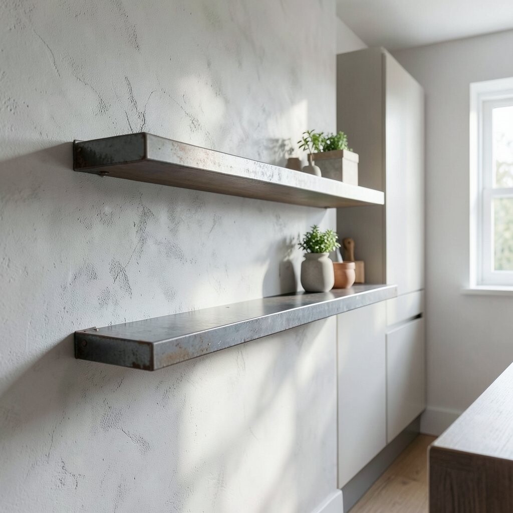 Metal ledges add an industrial touch to your kitchen. They are strong and durable, perfect for heavy items.
