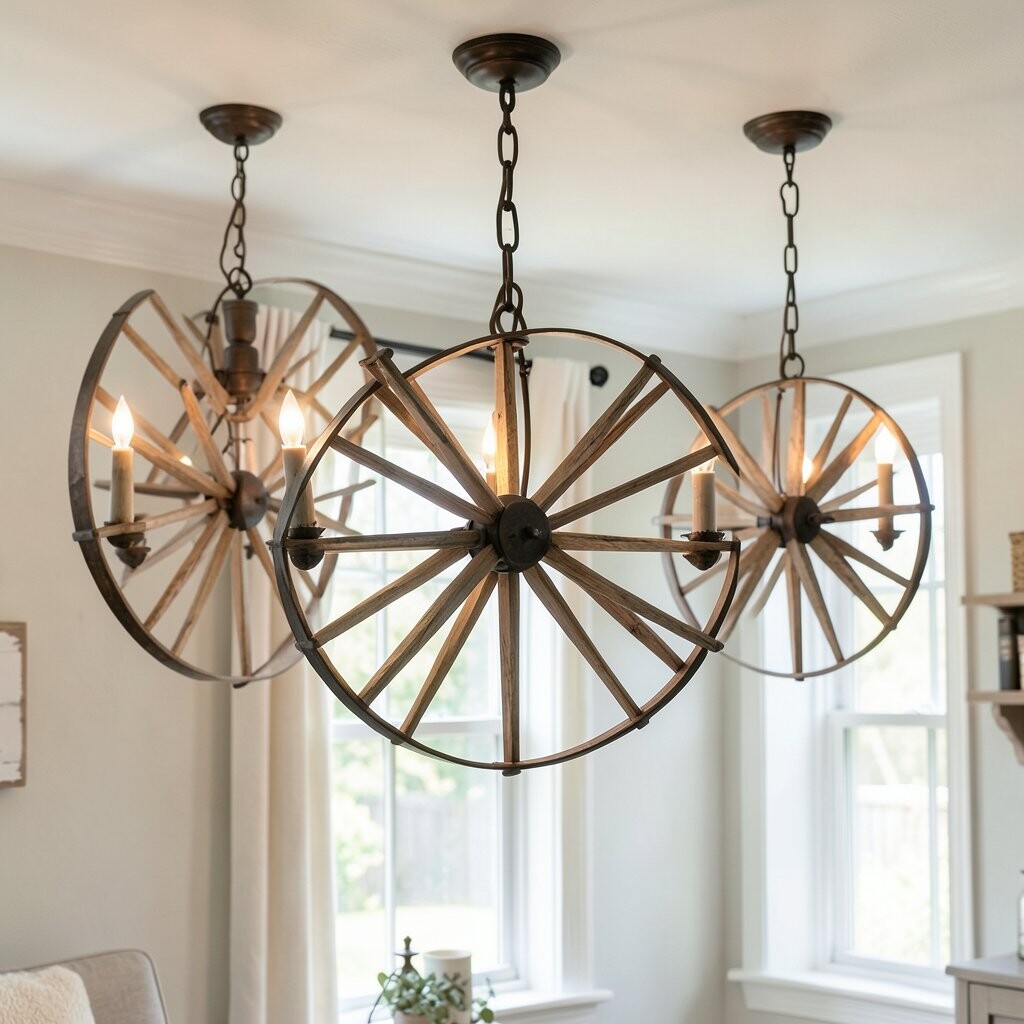 Wagon wheel chandeliers offer a charming farmhouse appeal. They often feature rustic wood and metal elements.