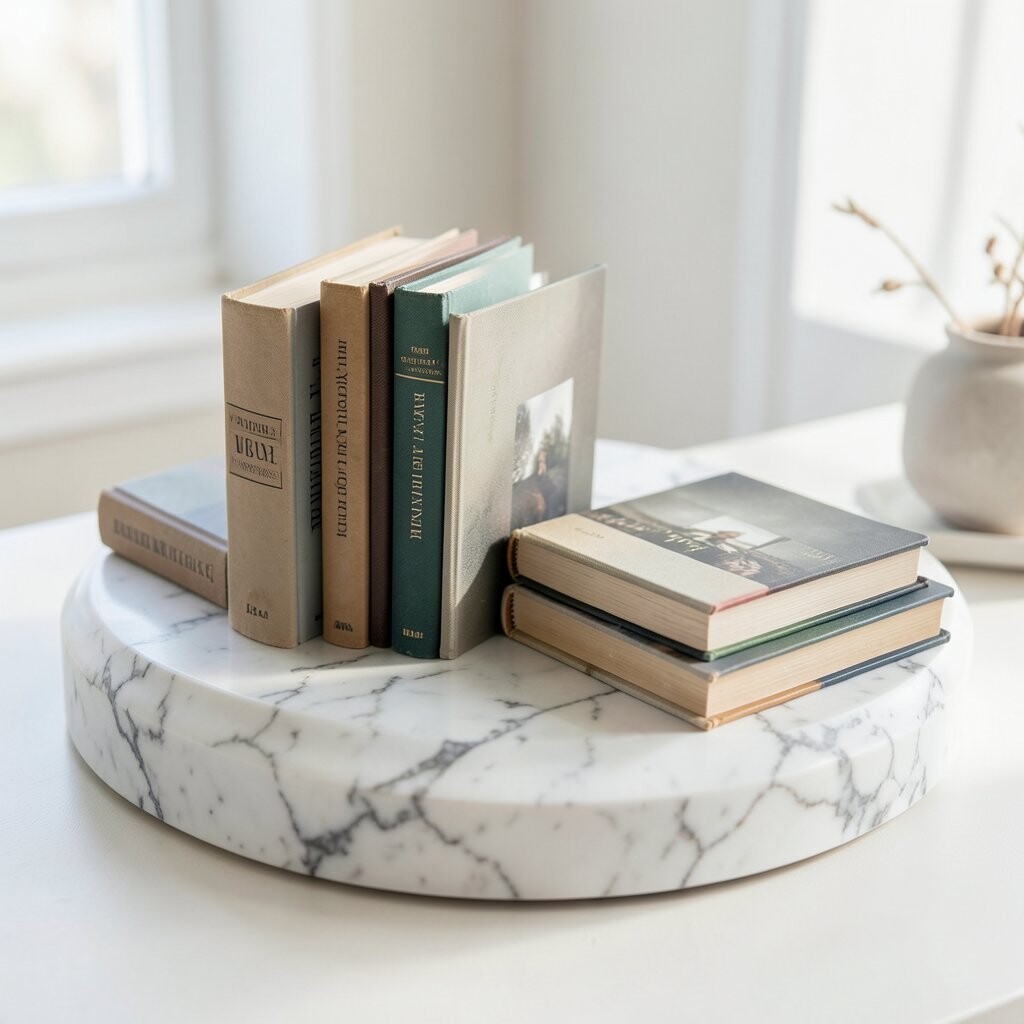 Stack a few of your favorite books on your marble base for a chic, intellectual touch. It adds depth and character to the space.
