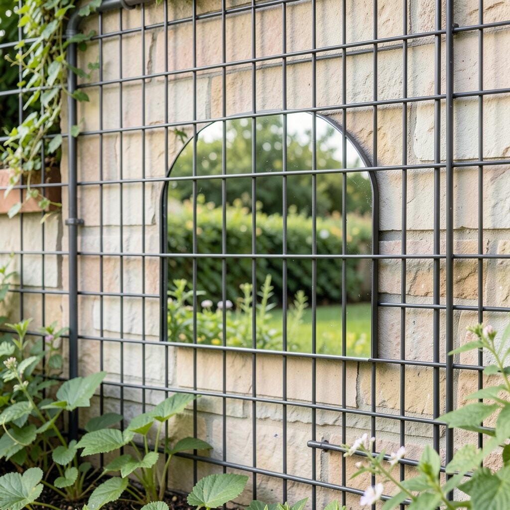 Add depth and light with an outdoor mirror feature. A mirror on a metal grid reflects beauty and space.