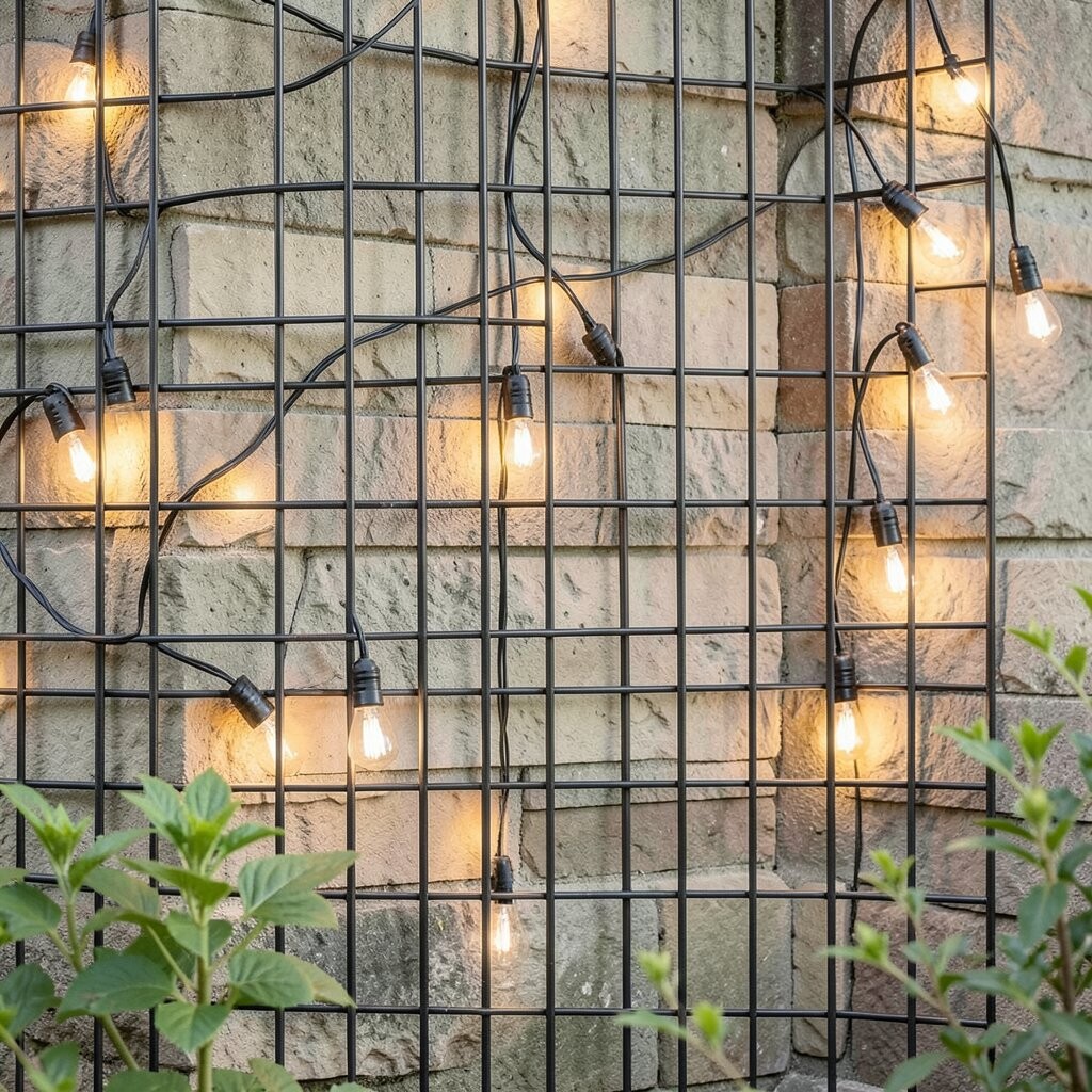 Enhance your garden with a string light display. A metal grid provides the perfect support for twinkling lights.