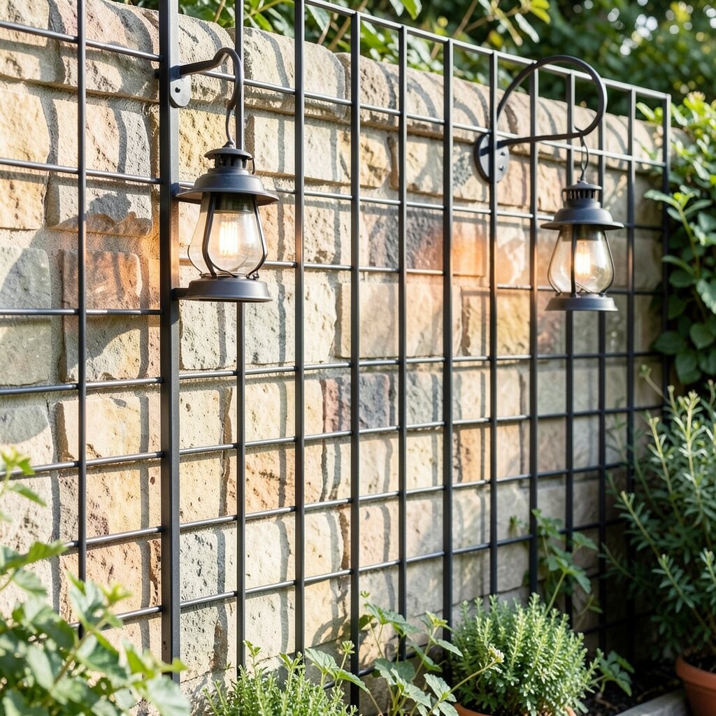 Metal grids offer an excellent framework for hanging lanterns. It creates a magical ambiance in your garden at night.
