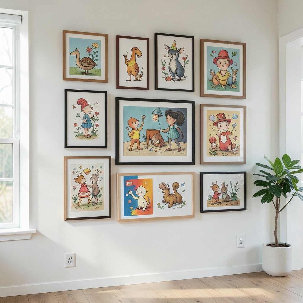 This idea is perfect for those who love a touch of humor. Illustrations can be found in children’s books or online. They’re often affordable and easy to swap out. Whimsical art keeps your gallery wall lively and engaging.