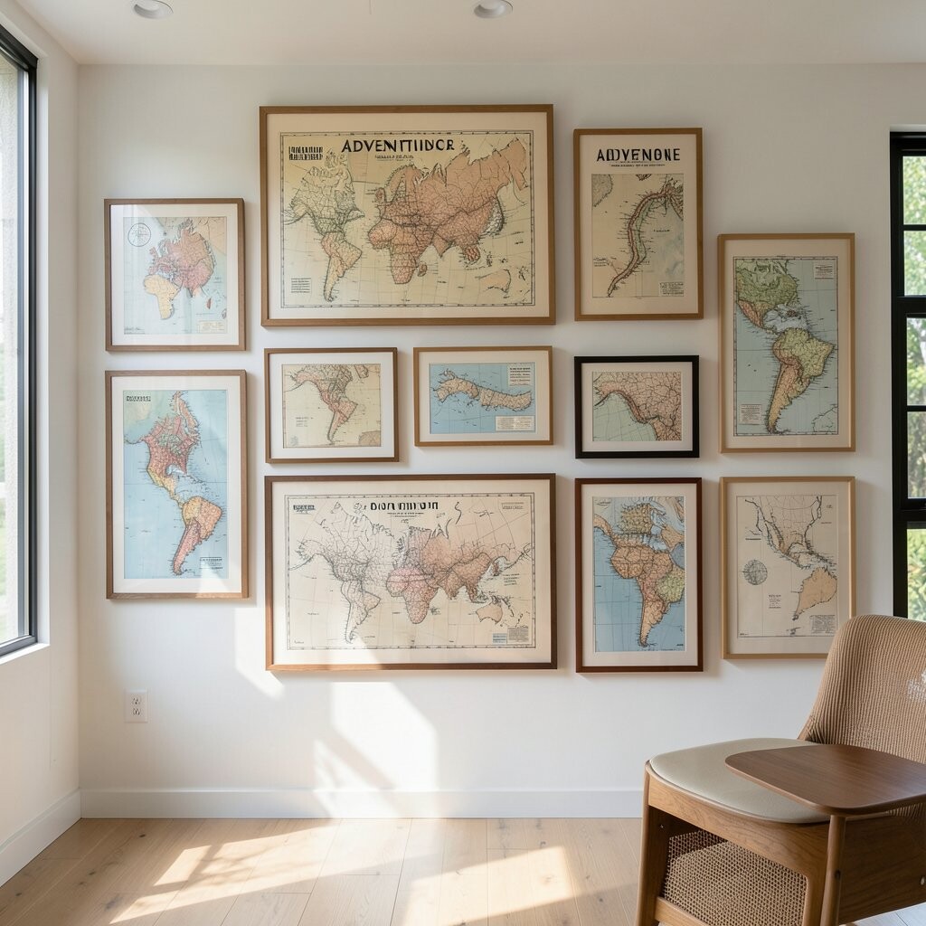 Vintage maps bring a sense of adventure to your gallery wall. They tell tales of exploration and discovery. Choose maps of places you’ve visited or dream of visiting. They add a worldly and nostalgic touch to your decor.