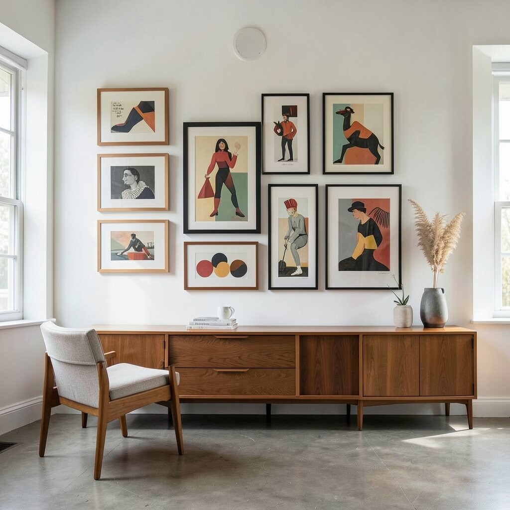 Whimsical illustrations add a playful touch to your gallery wall. They’re light-hearted and full of charm. Choose illustrations of animals, people, or everyday objects. These pieces bring joy and a sense of wonder to your space.