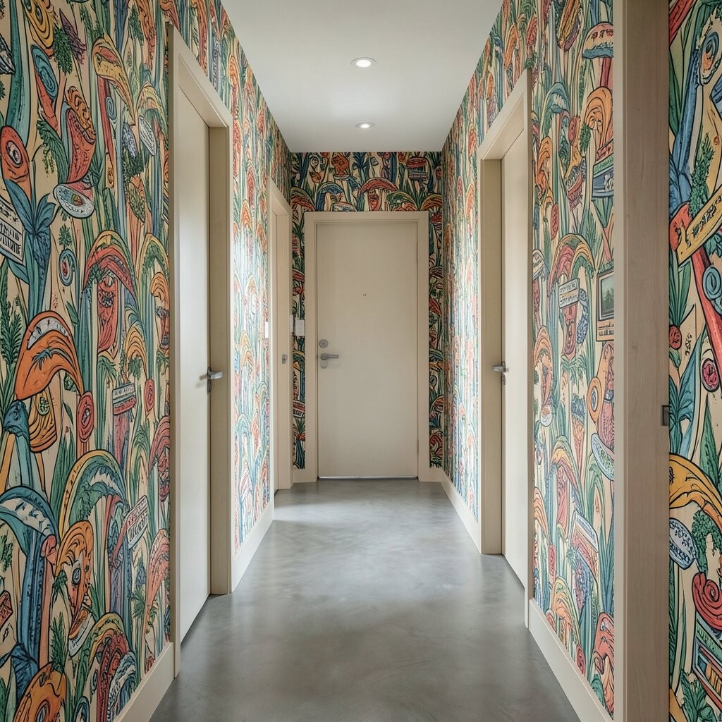 Wallpaper with funky patterns can transform your hallway walls into a piece of art. It’s an eye-catching way to personalize your space.