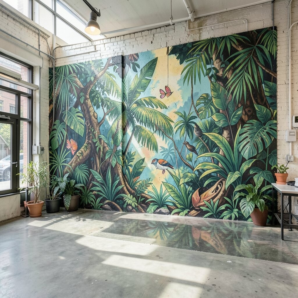 Imagine lush greenery painted on the walls, creating an oasis in the middle of the city. This idea brings nature indoors, offering a refreshing escape from the hustle and bustle.