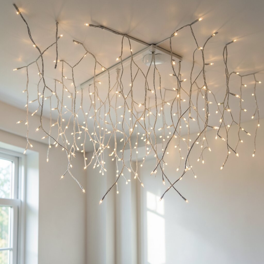 Hang lights in a crisscross pattern or randomly for a unique effect. This setup is perfect for bedrooms or playrooms.