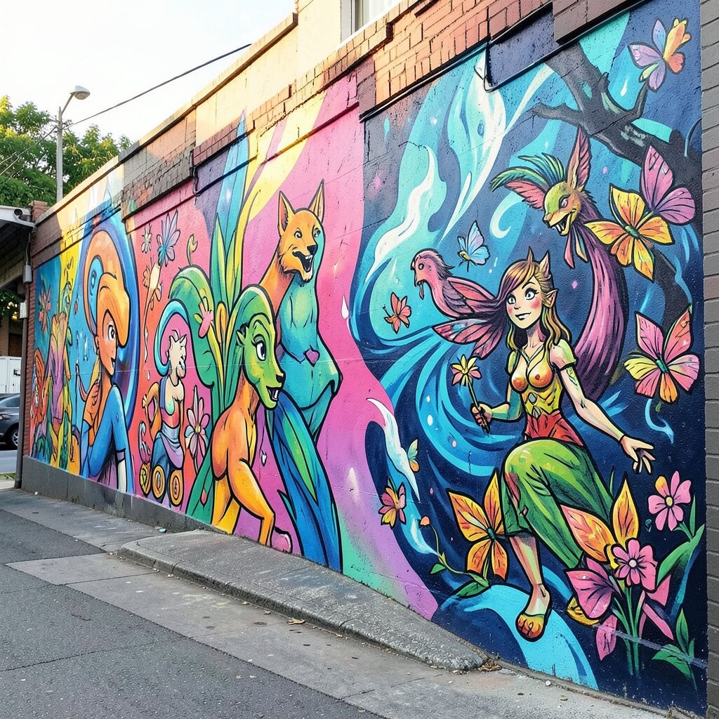 Step into a world of fantasy with a mural that features mythical creatures and magical landscapes. It’s a portal to another realm.