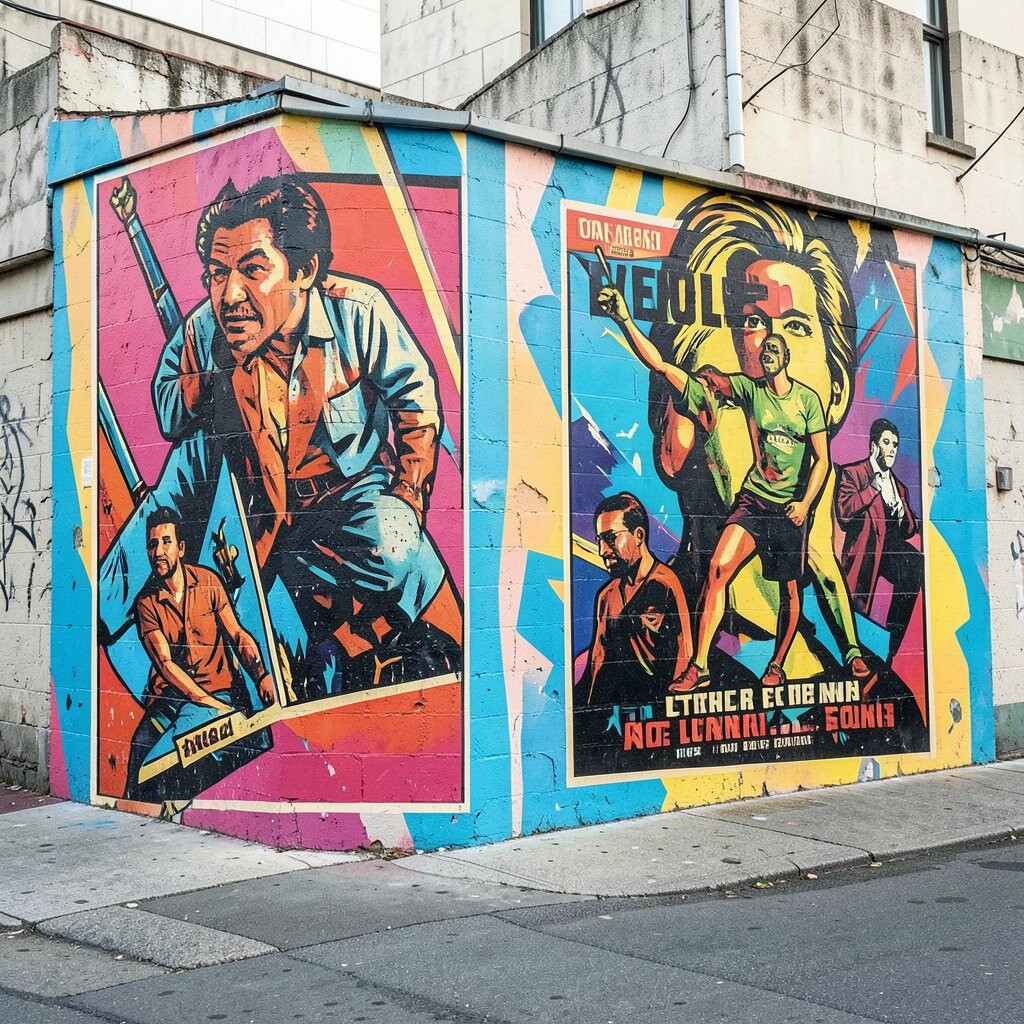 Celebrate the golden age of cinema with a mural featuring vintage movie posters. It’s like a trip to the classic theaters of old.