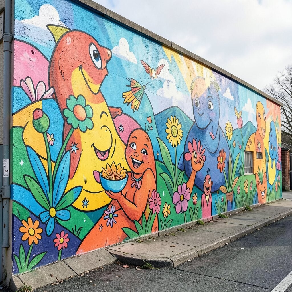 Imagine stepping into a dreamscape filled with playful characters and vivid colors. This mural turns any room into a lively, enchanting space.