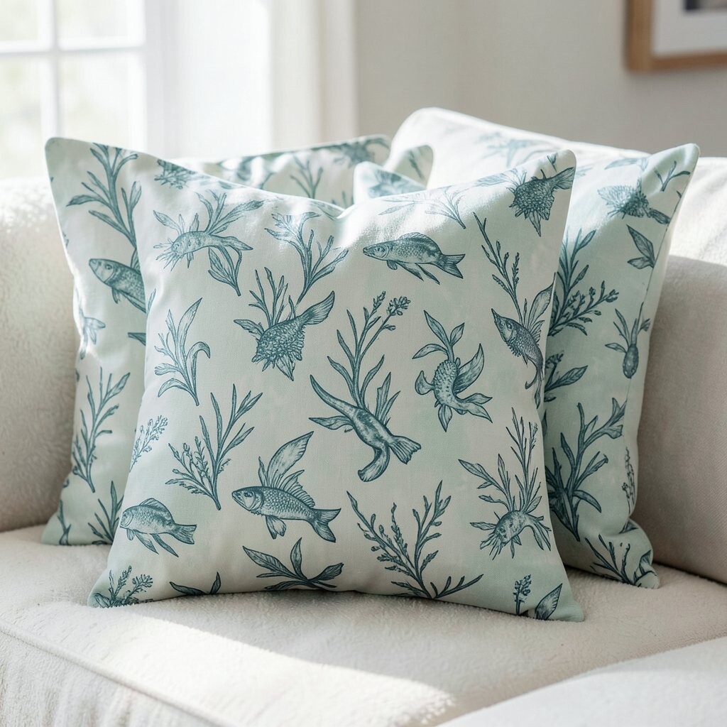 Throw pillows are like the jewelry of a room, and seafoam print ones can add a pop of cool color. They’re perfect for living rooms or bedrooms.