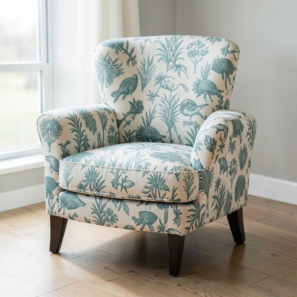 An accent chair in seafoam print can be a statement piece in any room. It adds personality and a pop of color.