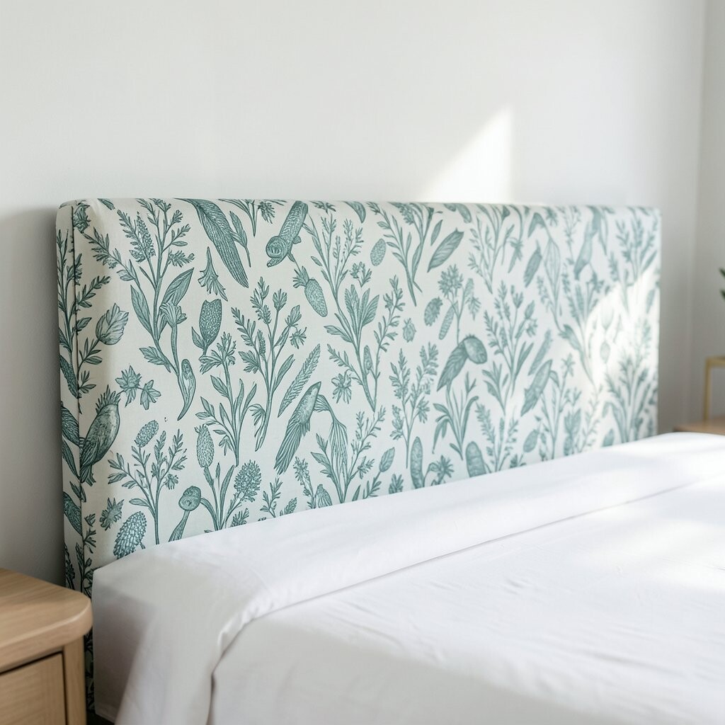 A fabric headboard in seafoam print can become the centerpiece of your bedroom. It adds texture and color to your sleeping space.