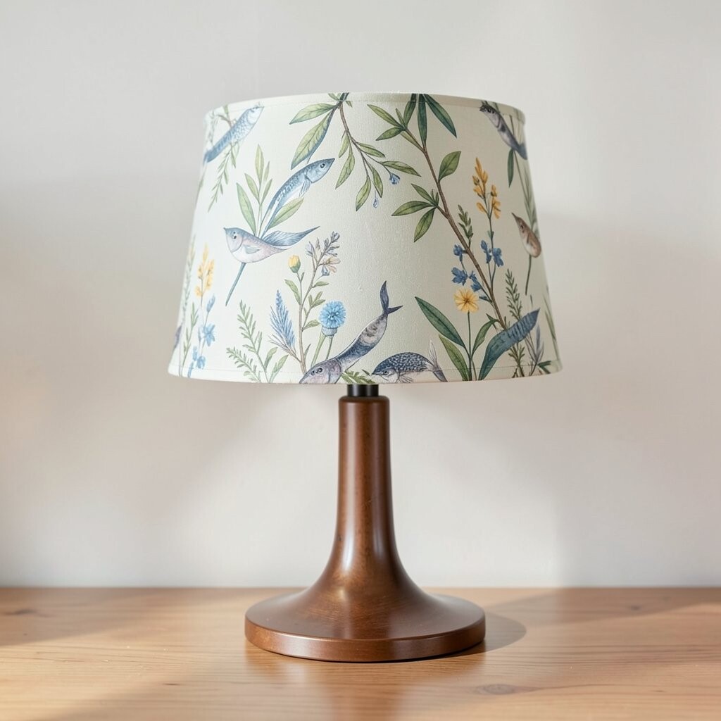 A lampshade in seafoam print adds a splash of color and warmth. It’s a stylish way to illuminate your room.