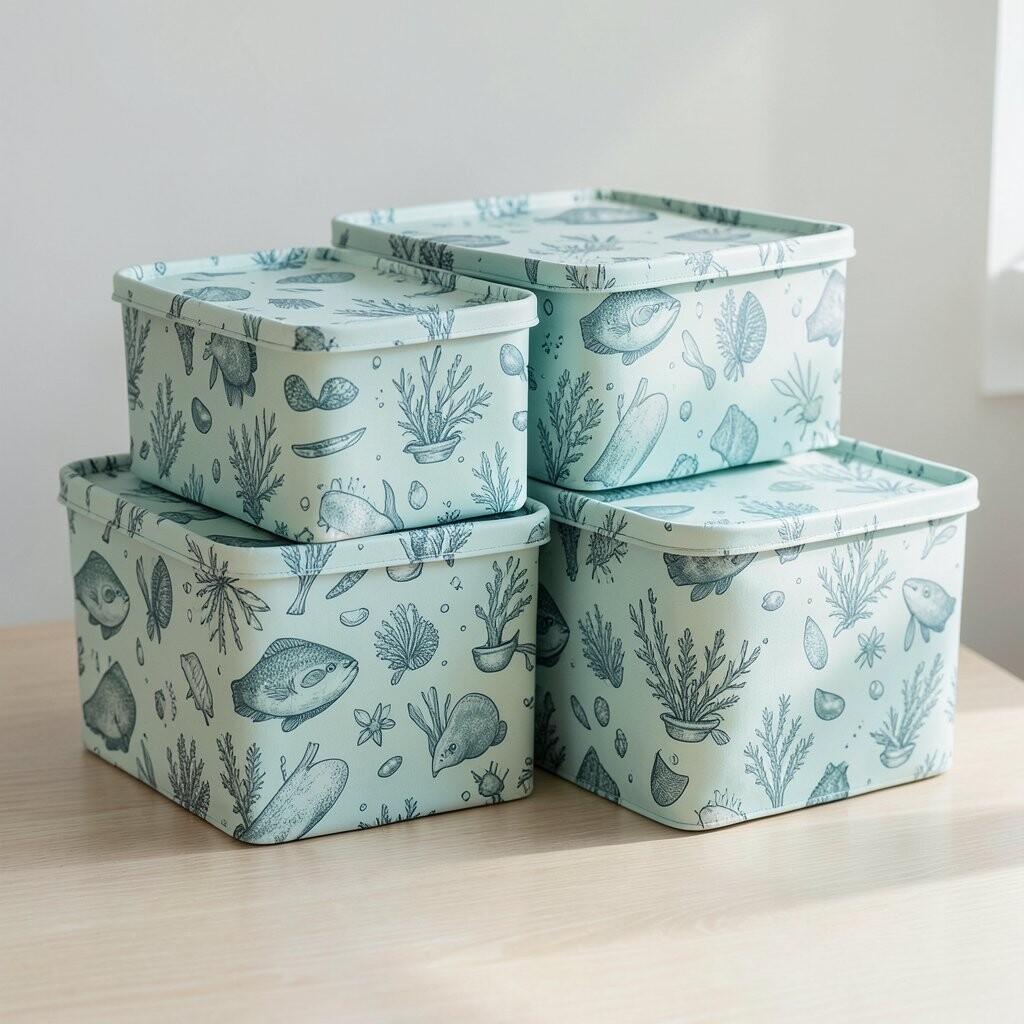 Seafoam print storage bins add style and organization to your home. They’re a pretty way to keep things tidy.