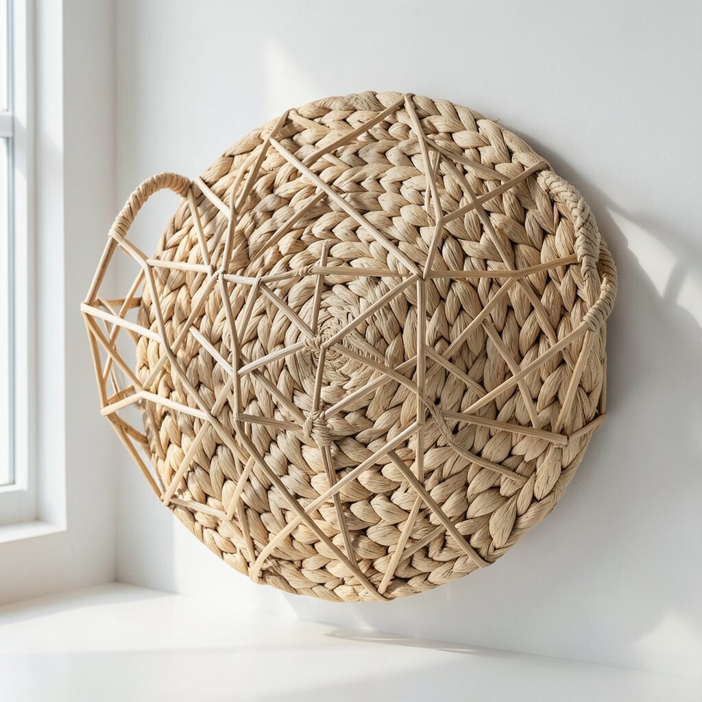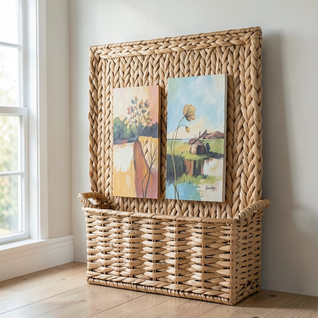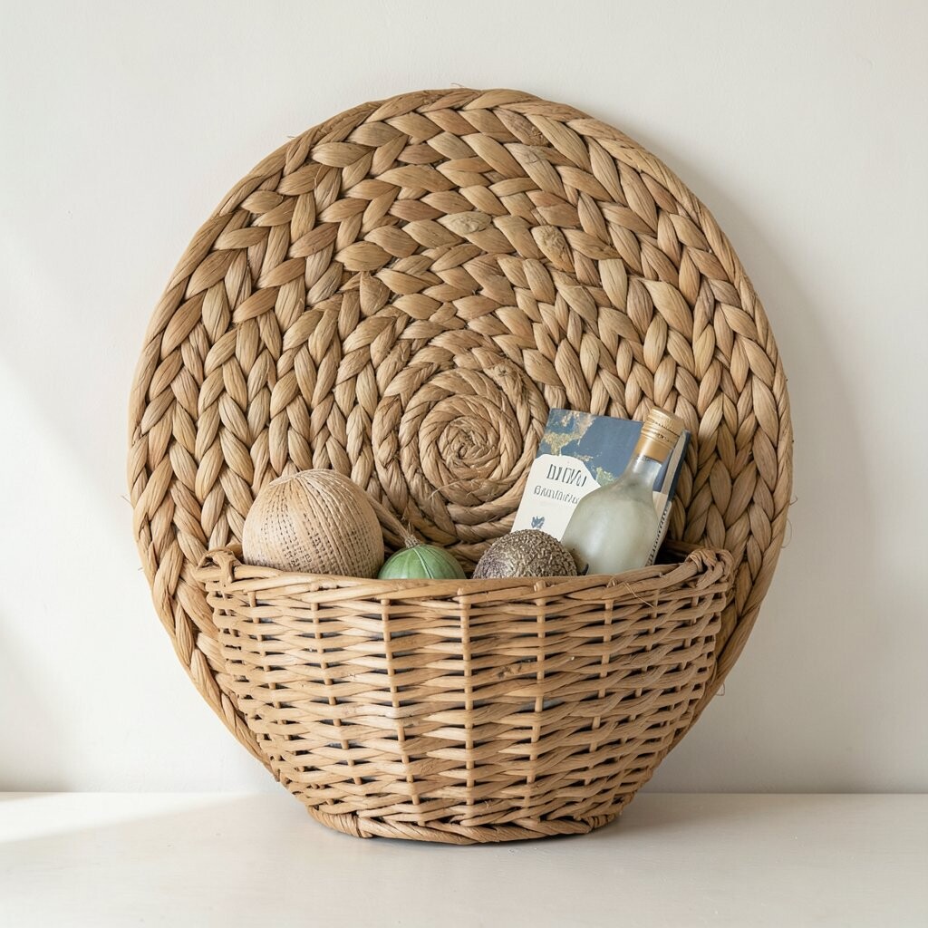 Straw baskets with intricate patterns can serve as standalone art pieces. Look for baskets with natural dyes and geometric designs.