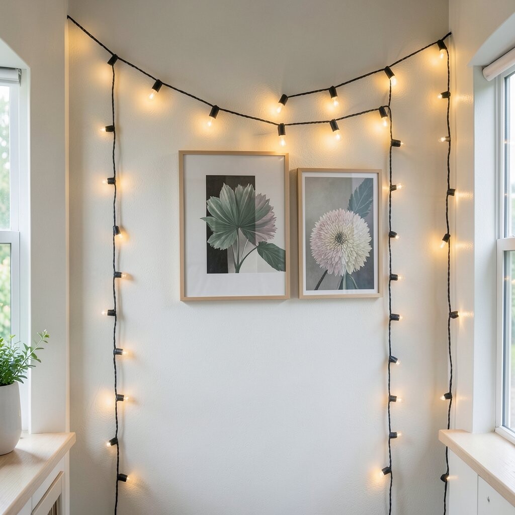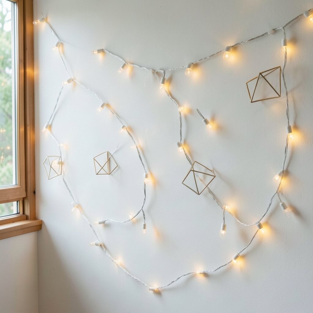 Use string lights to create geometric shapes on the wall. It’s a modern approach to lighting and decor.