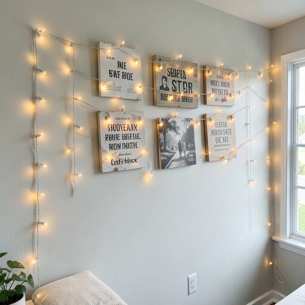 Create personalized wall art by shaping string lights into letters. It’s a fun way to add a personal touch to your decor.