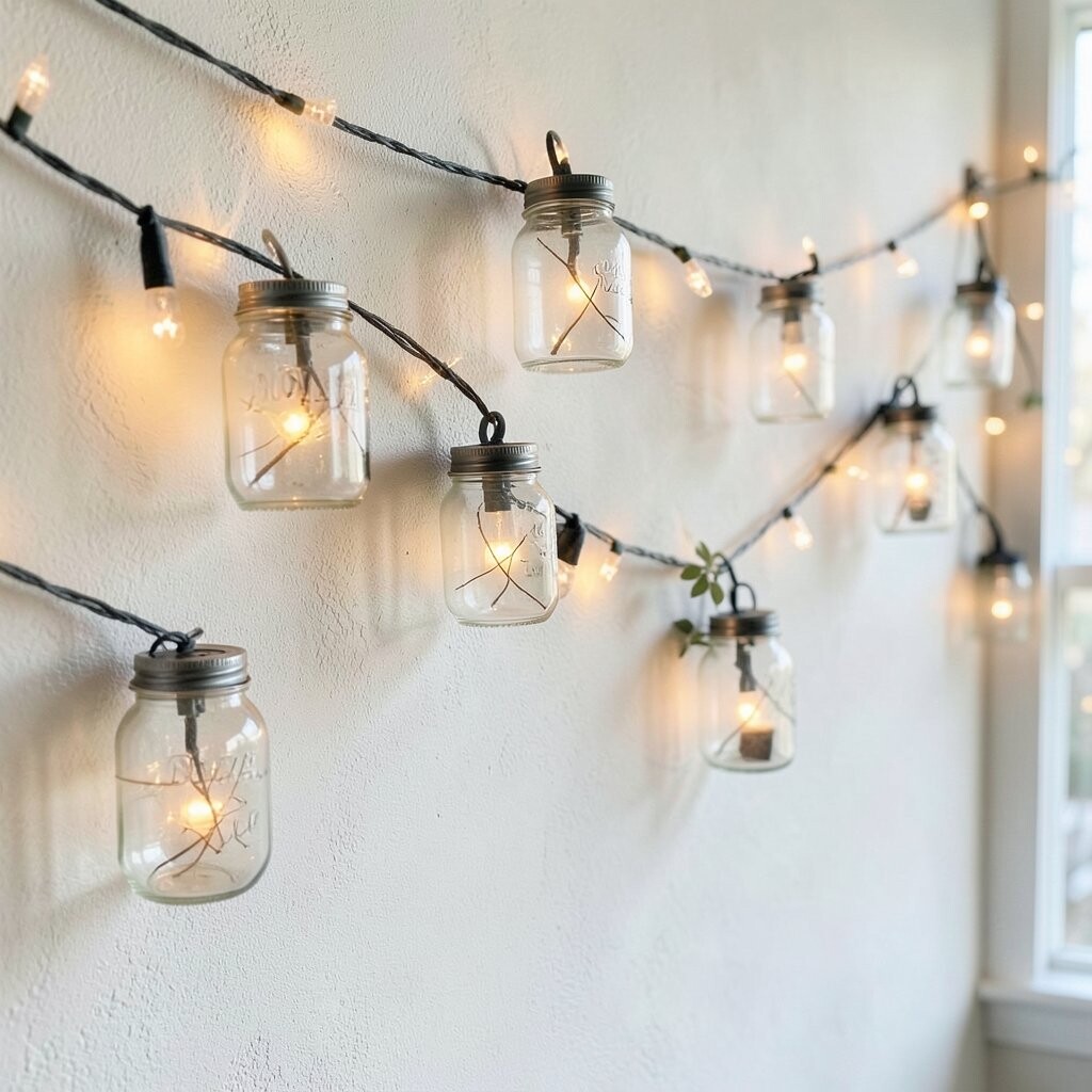 Combine mason jars with string lights for a rustic, charming look. Hang them on the wall to add depth and interest.