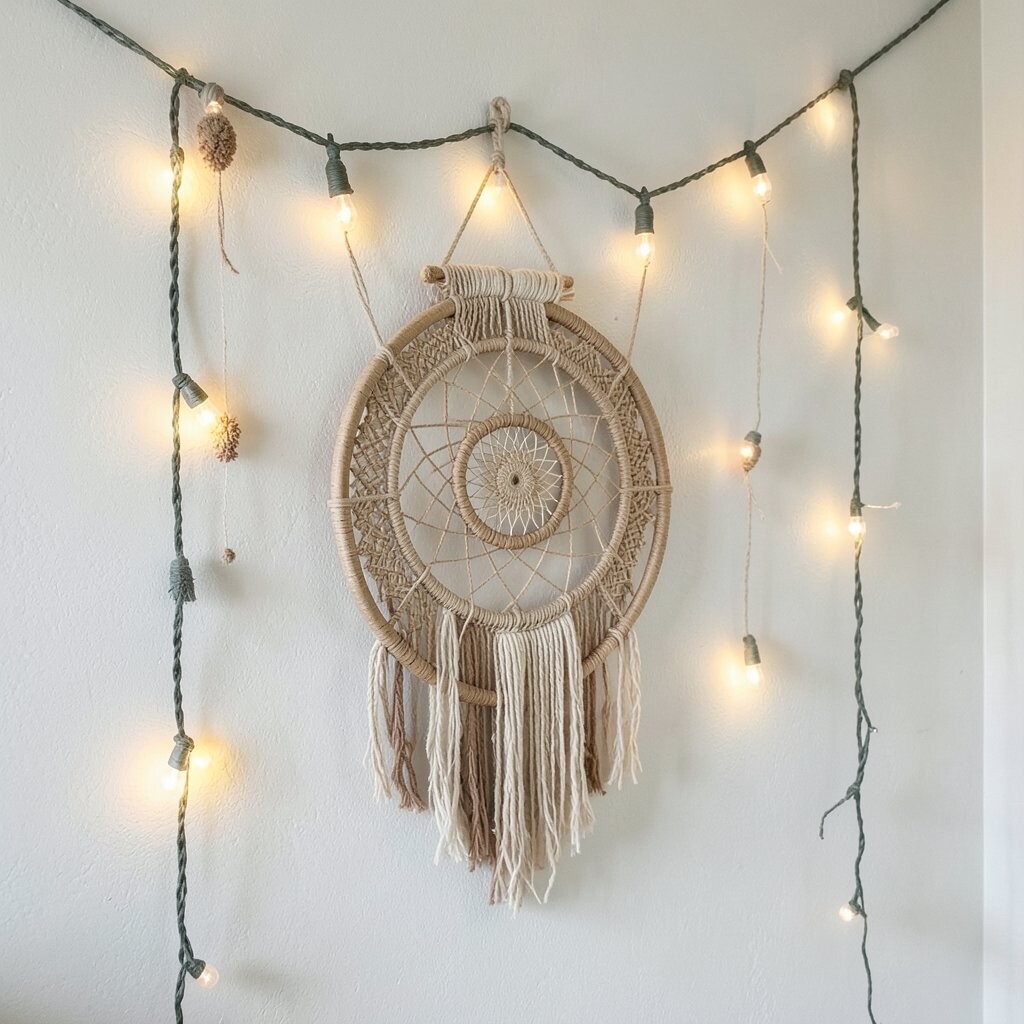 Wrap string lights around a dreamcatcher for a boho-chic vibe. Hang it on the wall for a unique focal point.