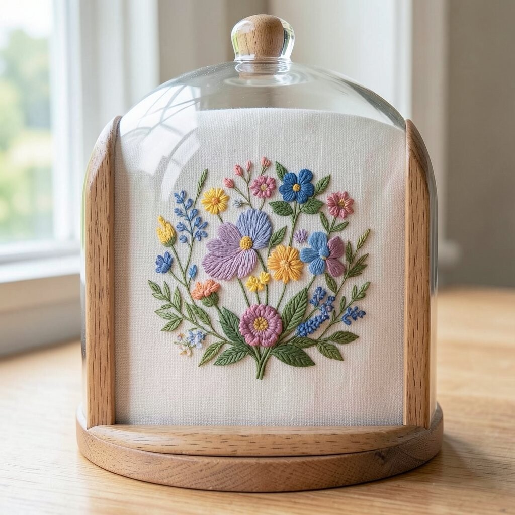 Glass domes are a unique way to display embroidery, adding a touch of whimsy and curiosity. They’re like little worlds encapsulating your art.