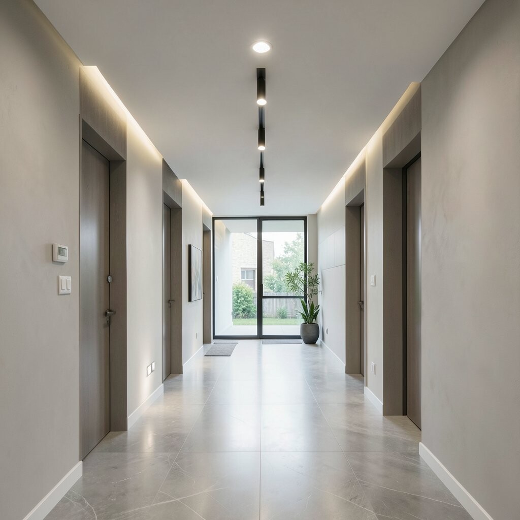 Track lighting can add drama to hallways. It guides guests with a stylish glow.