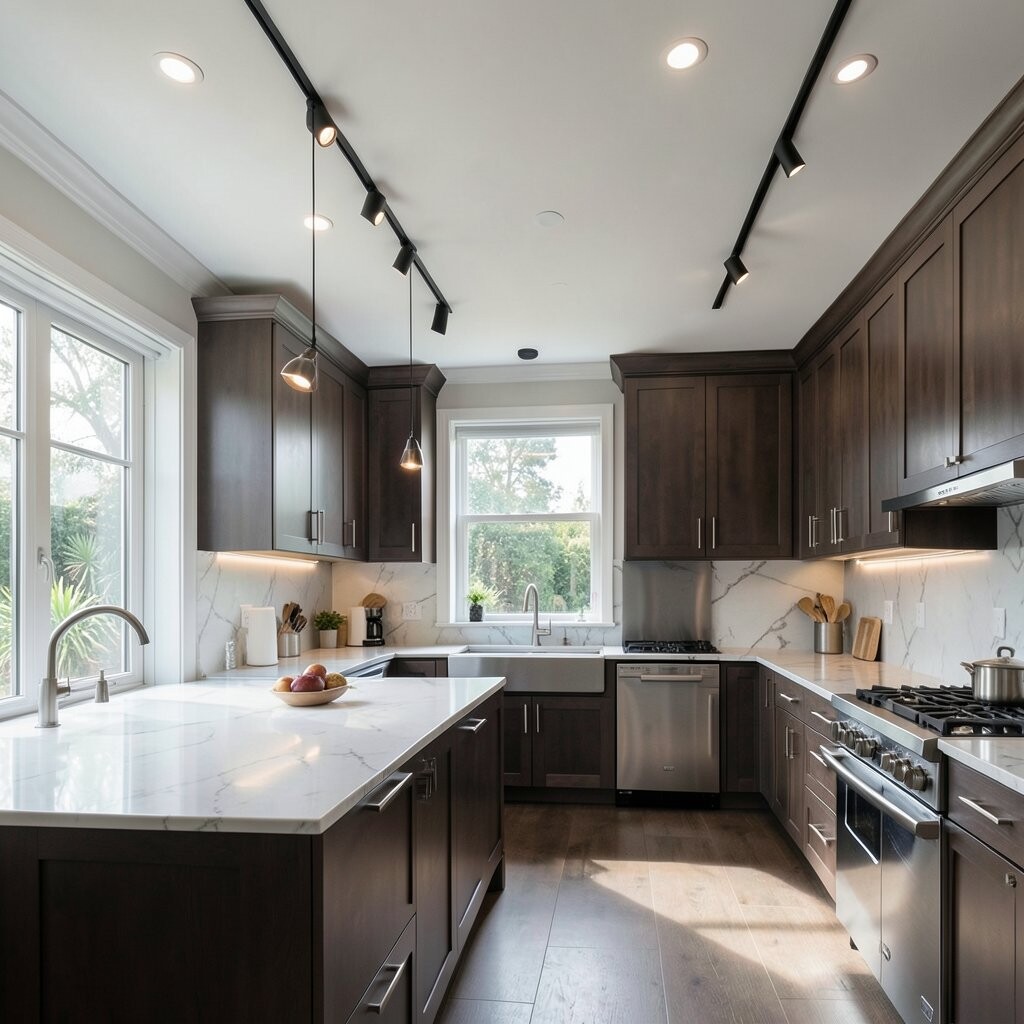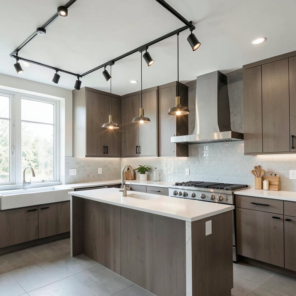 Track lighting transforms kitchens into sleek, modern spaces. It’s ideal for task lighting over islands and counters.