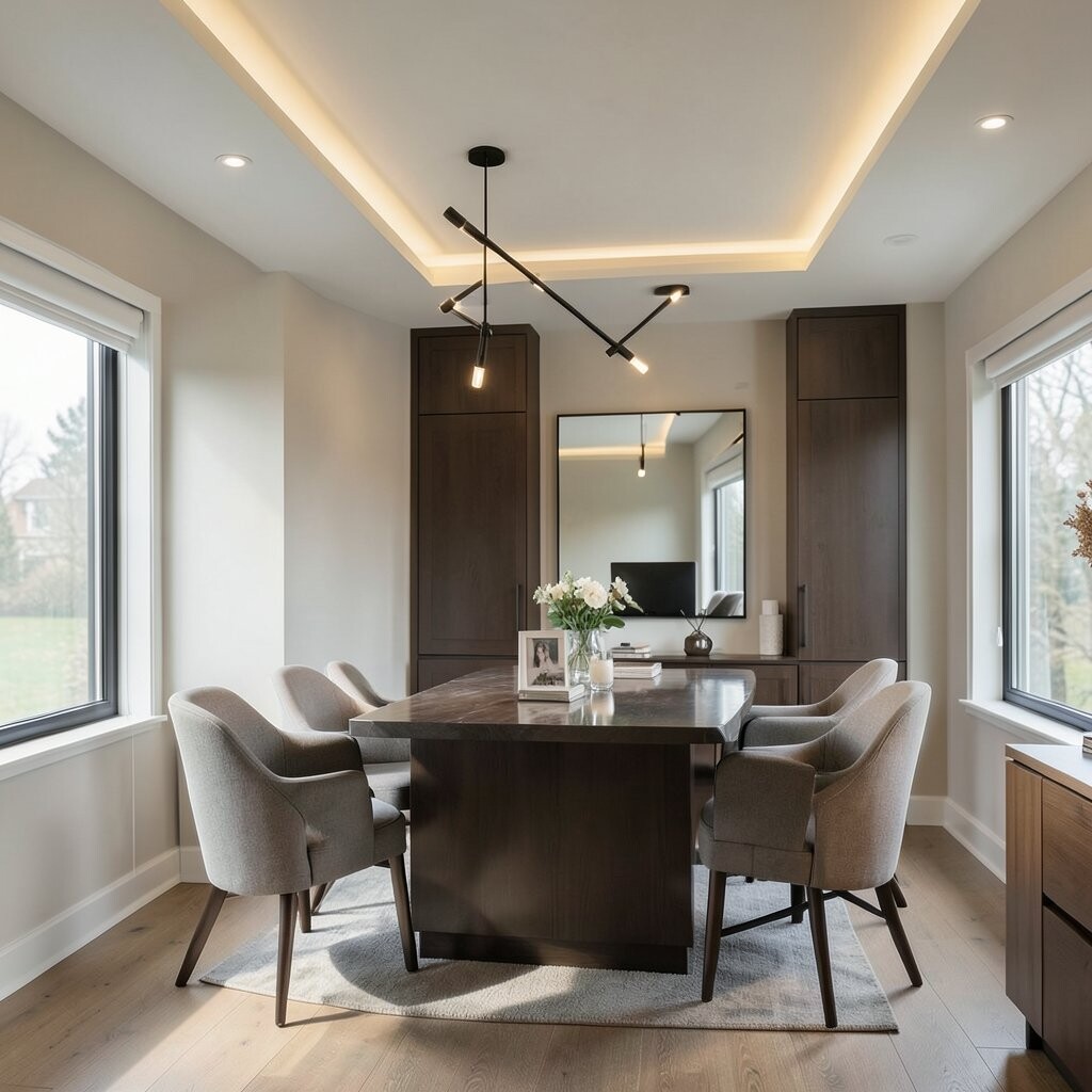 Track lighting is versatile for dining areas. It adapts to both intimate dinners and lively gatherings.
