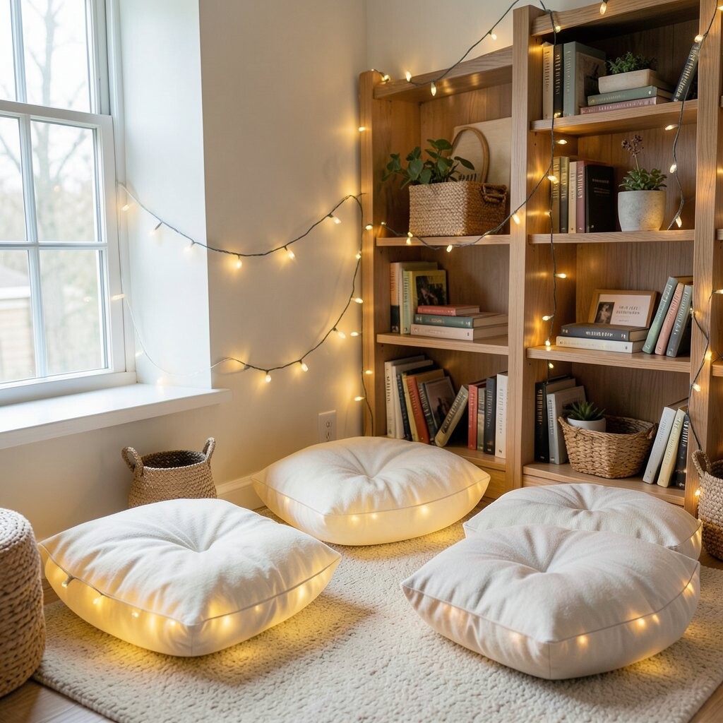 Place oversized floor pillows under a canopy of string lights for a plush seating area. This setup invites you to sink in and stay a while.