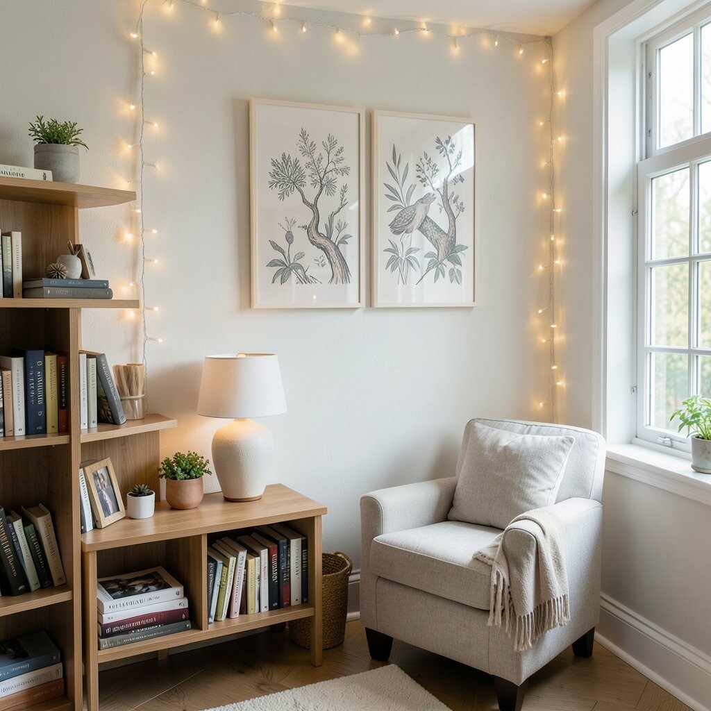 Combine string lights with fabric shades for a soft, diffused glow. This setup creates a gentle, soothing ambiance in your reading corner.