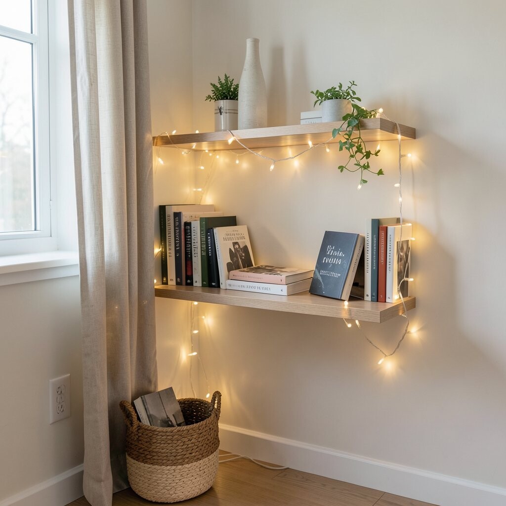 Install floating shelves with string lights for a modern, airy look. This setup showcases your favorite books and trinkets beautifully.