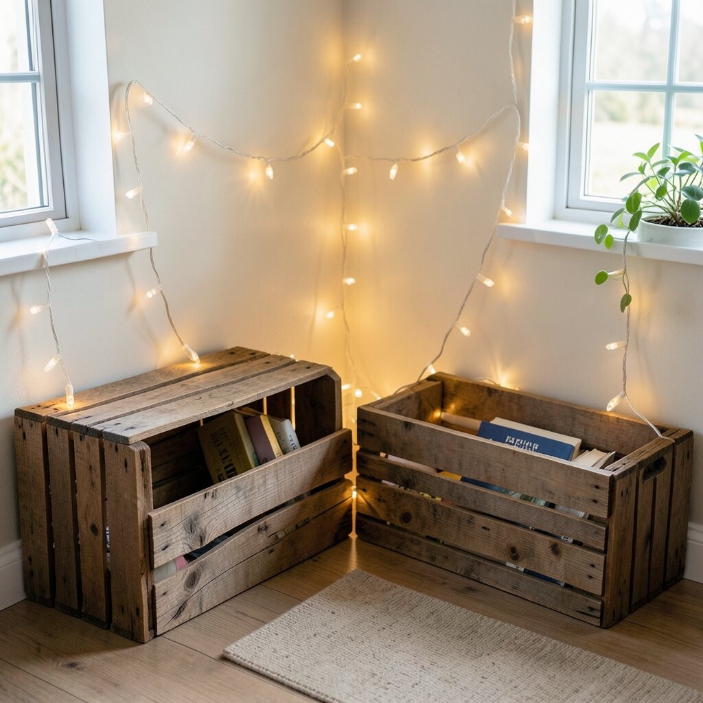 Use wooden crates filled with string lights as storage and decor. This setup adds a rustic, farmhouse feel to your reading corner.